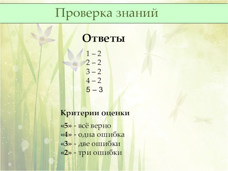 Проверка знанийОтветы	1 – 2	2 – 2	3 – 2	4 – 2	5 – 3Критерии оценки«5» - всё верно«4» -