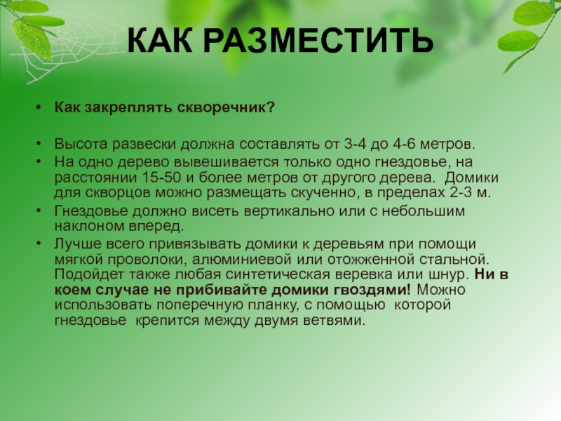 На одно дерево вывешивается только одно гнездовье, на расстоянии 15-50 и более метров от другого дерева. Домики для скворцов можно размещать скученно, в пределах 2-3 м.