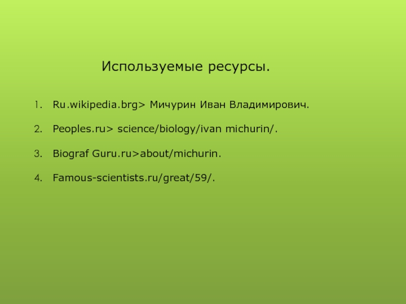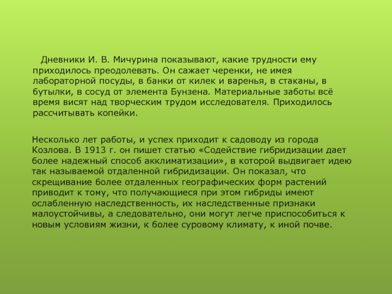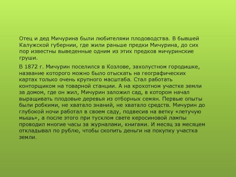 Иван Владимирович Мичурин принадлежал к числу тех "чудаков", которые, по выражению Максима Горького, украшают мир. Он хотел юг "перенести" на север. Он хотел, чтобы где-нибудь в Воронежской или Тамбовской губернии и ещё дальше к северу росли зимостойкие сорта яблонь, груш, слив, винограда и другие растения с плодами не хуже прекрасных южных сортов.