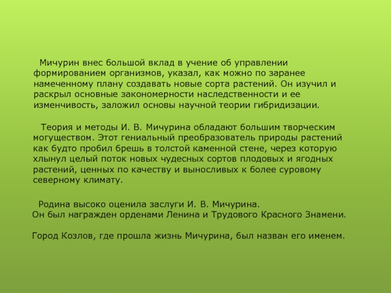 Мичурин внес большой вклад в учение об управлении формированием организмов, указал, как можно по заранее намеченному плану создавать новые сорта растений. Он изучил и раскрыл основные закономерности наследственности и ее изменчивость, заложил основы научной теории гибридизации.