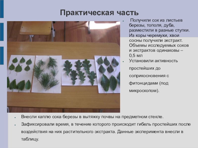 Получили сок из листьев березы, тополя, дуба, разместили в разные ступки. Из коры черемухи, хвои сосны получили экстракт. Объемы исследуемых соков и экстрактов одинаковы – 0,5 мл