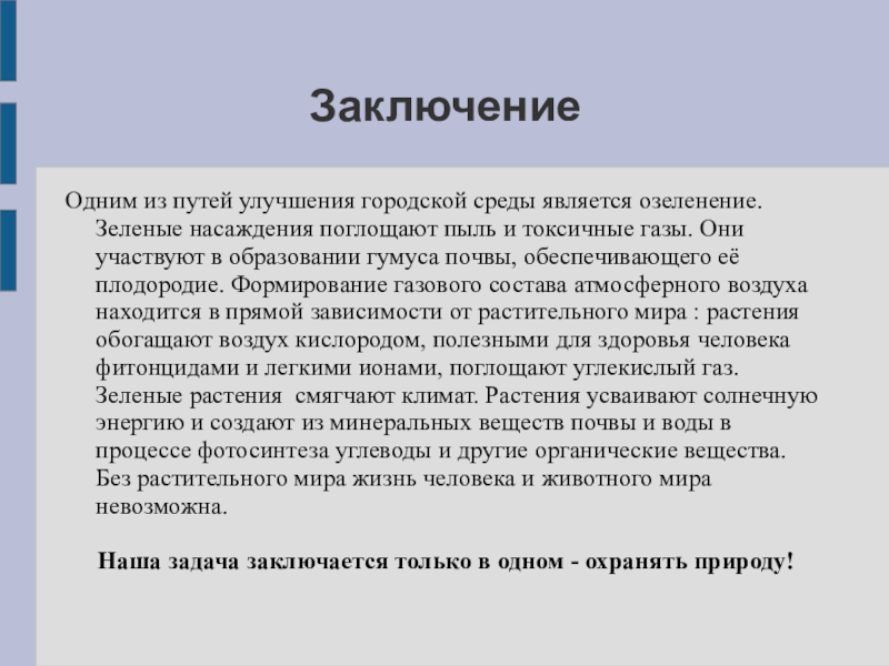 пыль и токсичные газы. Они участвуют в образовании гумуса почвы, обеспечивающего её плодородие. Формирование газового состава атмосферного воздуха находится в прямой зависимости от растительного мира : растения обогащают воздух кислородом, полезными для здоровья человека фитонцидами и легкими ионами, поглощают углекислый газ. Зеленые растения смягчают климат. Растения усваивают солнечную энергию и создают из минеральных веществ почвы и воды в процессе фотосинтеза углеводы и другие органические вещества. Без растительного мира жизнь человека и животного мира невозможна.