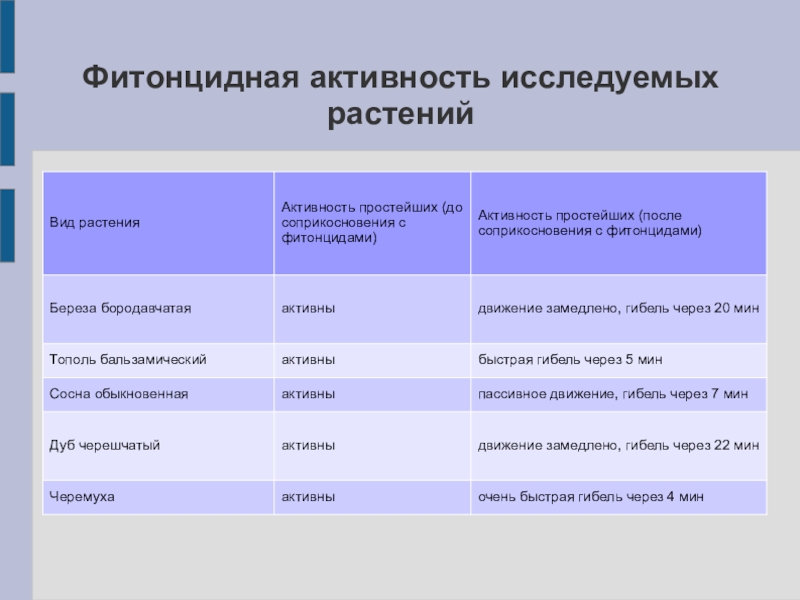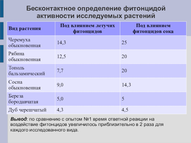 2. Сила действия фитонцидов различается как у разных растений, так и между летучими веществами и в соке.