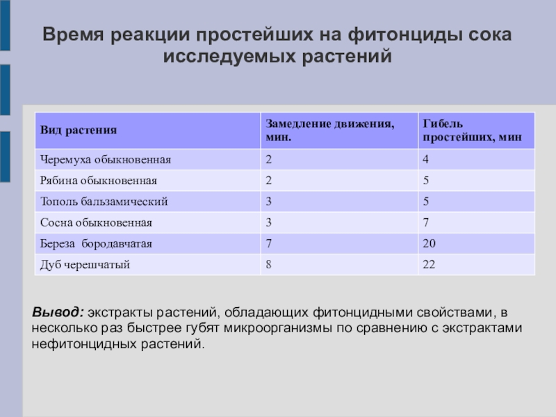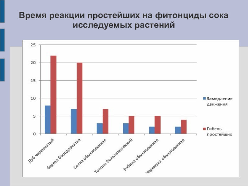 Слайд 13Время реакции простейших на фитонциды сока исследуемых растений