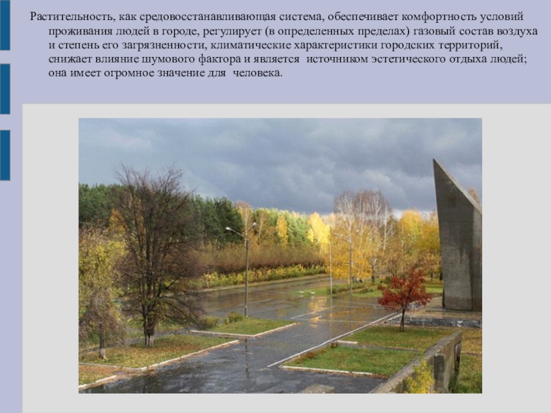 Слайд 2Растительность, как средовосстанавливающая система, обеспечивает комфортность условий проживания людей в городе,