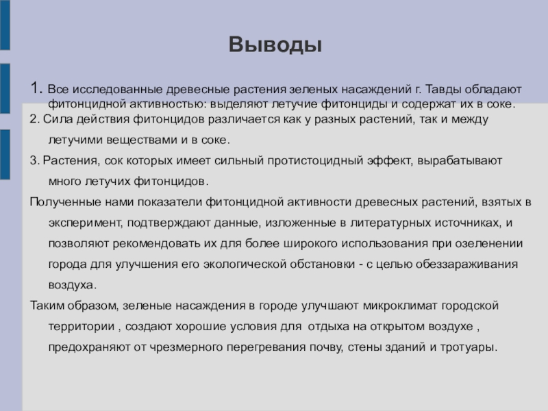 Полученные нами показатели фитонцидной активности древесных растений, взятых в эксперимент, подтверждают данные, изложенные в литературных источниках, и позволяют рекомендовать их для более широкого использования при озеленении города для улучшения его экологической обстановки - с целью обеззараживания воздуха.