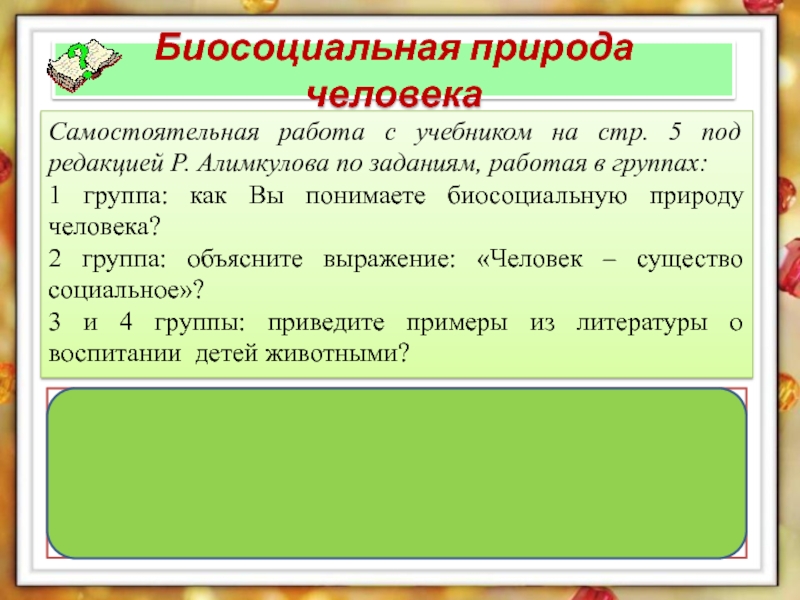 1 группа: как Вы понимаете биосоциальную природу человека?