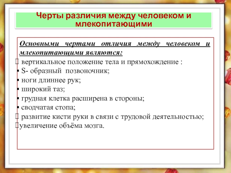 (Волосяной покров тела, млечные, сальные и потовые железы, специализированные зубы (резцы, клыки, коренные), четырехкамерное сердце и левая дуга аорты, легочное дыхание, наличие диафрагмы, высокоразвитый головной мозг, внутриутробное развитие зародыша, вскармливание детенышей молоком, интенсивный обмен веществ и постоянная температура тела).