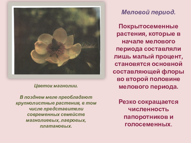 В позднем меле преобладают крупнолистные растения, в том числе представители современных семейств магнолиевых, лавровых, платановых.