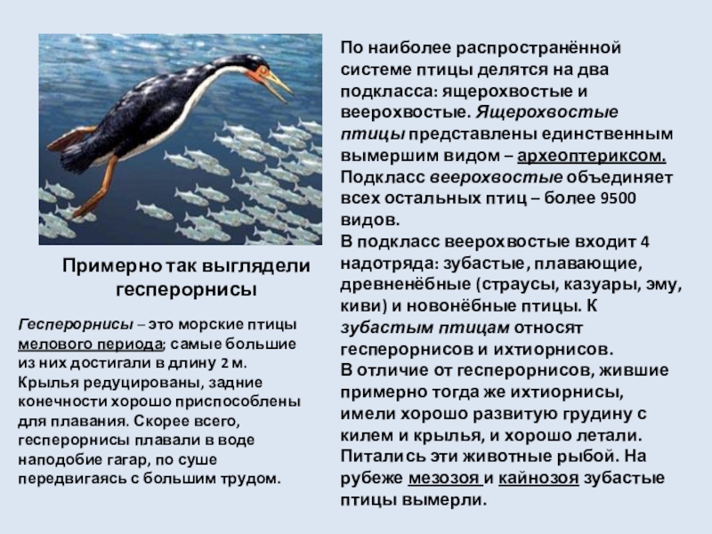 Гесперорнисы – это морские птицы мелового периода; самые большие из них достигали в длину 2 м. Крылья редуцированы, задние конечности хорошо приспособлены для плавания. Скорее всего, гесперорнисы плавали в воде наподобие гагар, по суше передвигаясь с большим трудом.