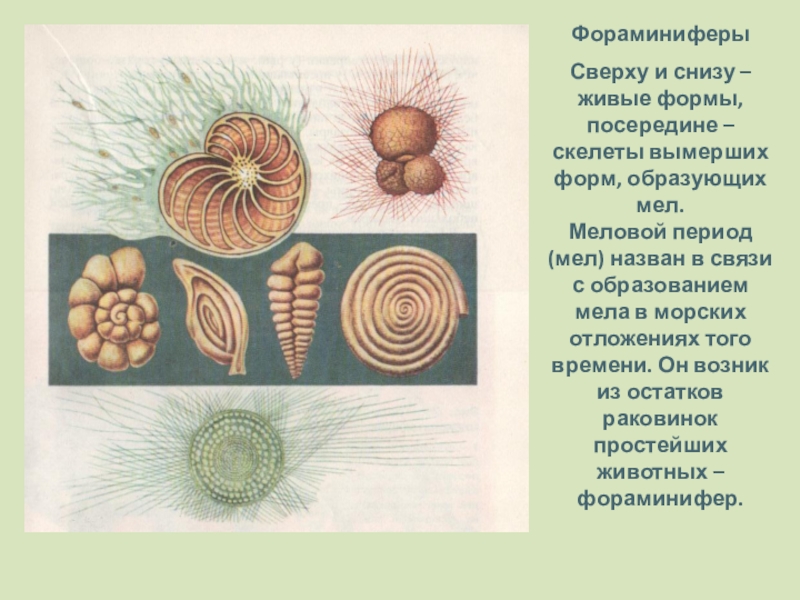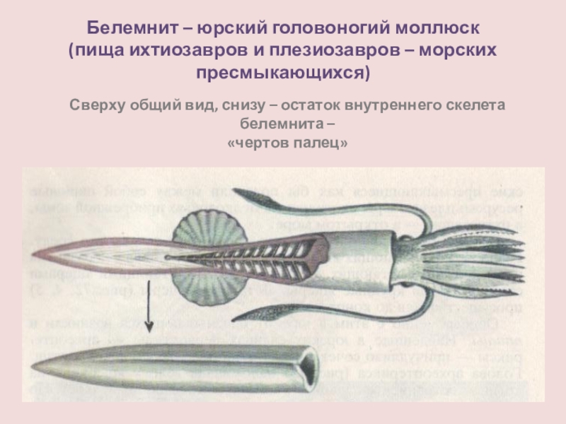 Сверху общий вид, снизу – остаток внутреннего скелета белемнита –