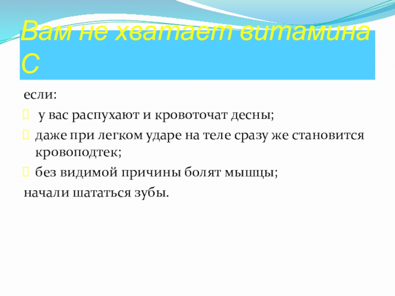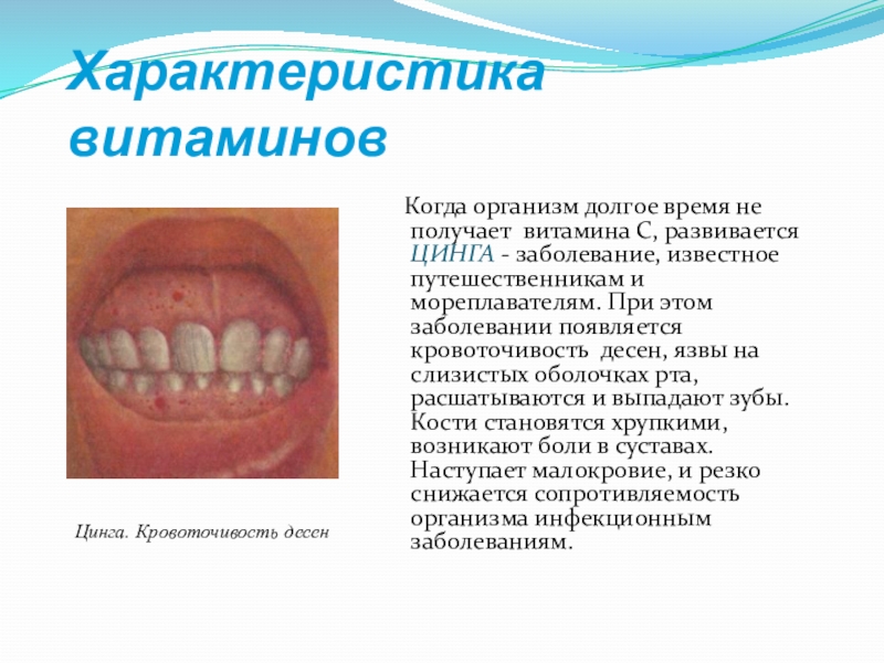 развивается ЦИНГА - заболевание, известное путешественникам и мореплавателям. При этом заболевании появляется кровоточивость десен, язвы на слизистых оболочках рта, расшатываются и выпадают зубы. Кости становятся хрупкими, возникают боли в суставах. Наступает малокровие, и резко снижается сопротивляемость организма инфекционным заболеваниям.
