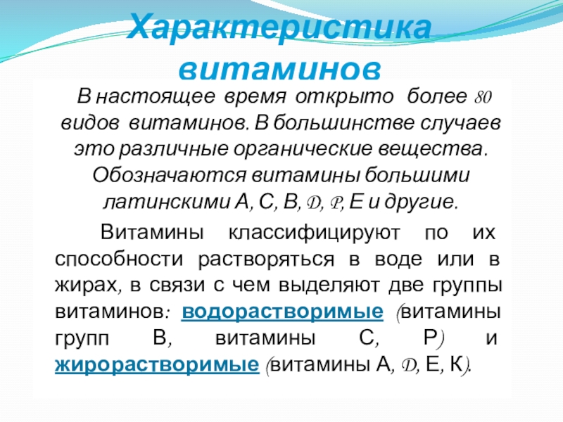 видов витаминов. В большинстве случаев это различные органические вещества. Обозначаются витамины большими латинскими А, С, В, D, P, Е и другие.