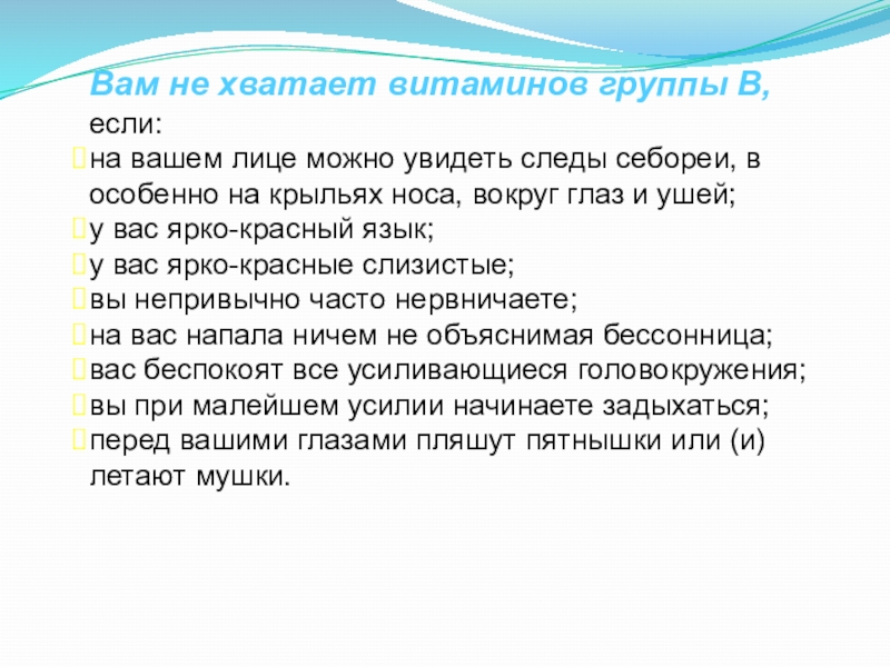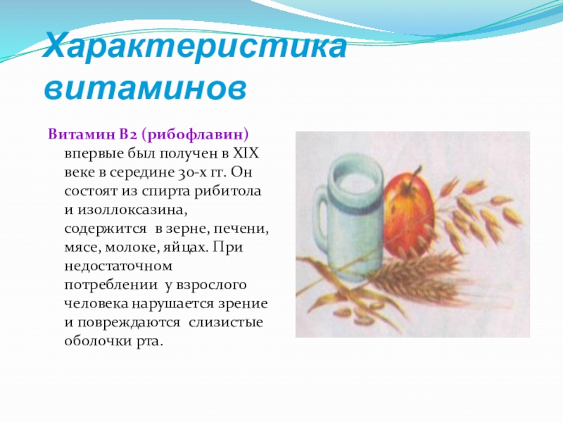 середине 30-х гг. Он состоят из спирта рибитола и изоллоксазина, содержится в зерне, печени, мясе, молоке, яйцах. При недостаточном потреблении у взрослого человека нарушается зрение и повреждаются слизистые оболочки рта.
