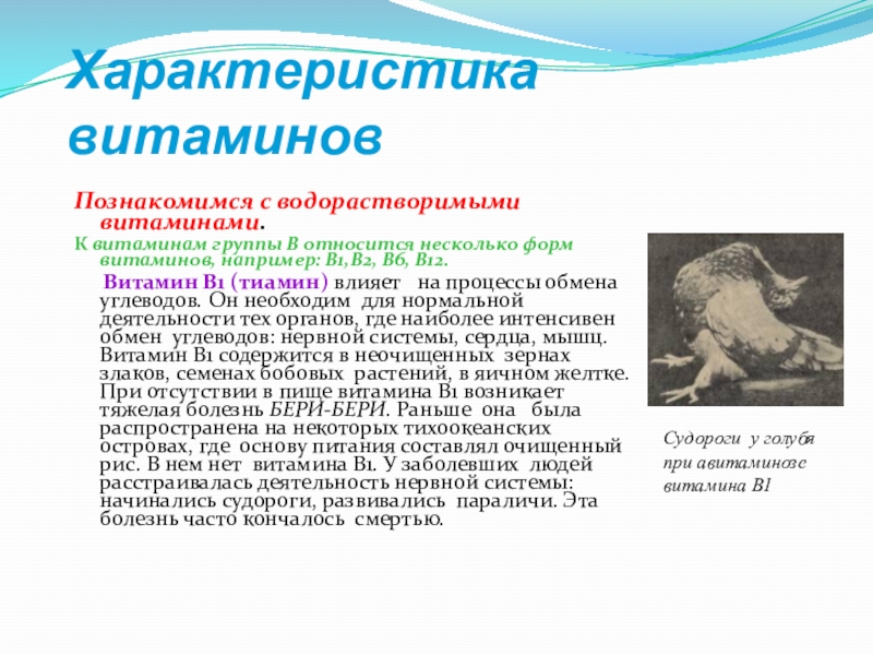 Витамин В1 (тиамин) влияет на процессы обмена углеводов. Он необходим для нормальной деятельности тех органов, где наиболее интенсивен обмен углеводов: нервной системы, сердца, мышц. Витамин В1 содержится в неочищенных зернах злаков, семенах бобовых растений, в яичном желтке. При отсутствии в пище витамина В1 возникает тяжелая болезнь БЕРИ-БЕРИ. Раньше она была распространена на некоторых тихоокеанских островах, где основу питания составлял очищенный рис. В нем нет витамина В1. У заболевших людей расстраивалась деятельность нервной системы: начинались судороги, развивались параличи. Эта болезнь часто кончалось смертью.