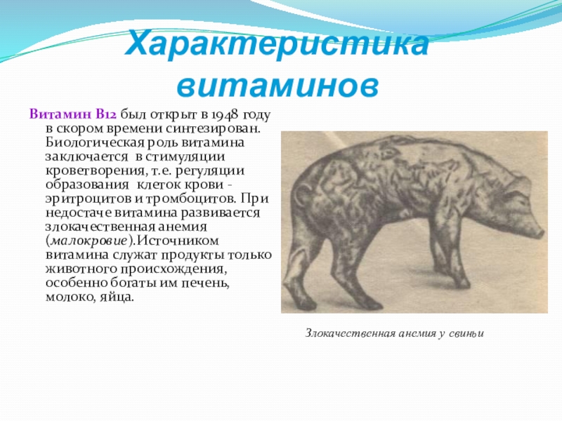 синтезирован. Биологическая роль витамина заключается в стимуляции кроветворения, т.е. регуляции образования клеток крови - эритроцитов и тромбоцитов. При недостаче витамина развивается злокачественная анемия (малокровие).Источником витамина служат продукты только животного происхождения, особенно богаты им печень, молоко, яйца.