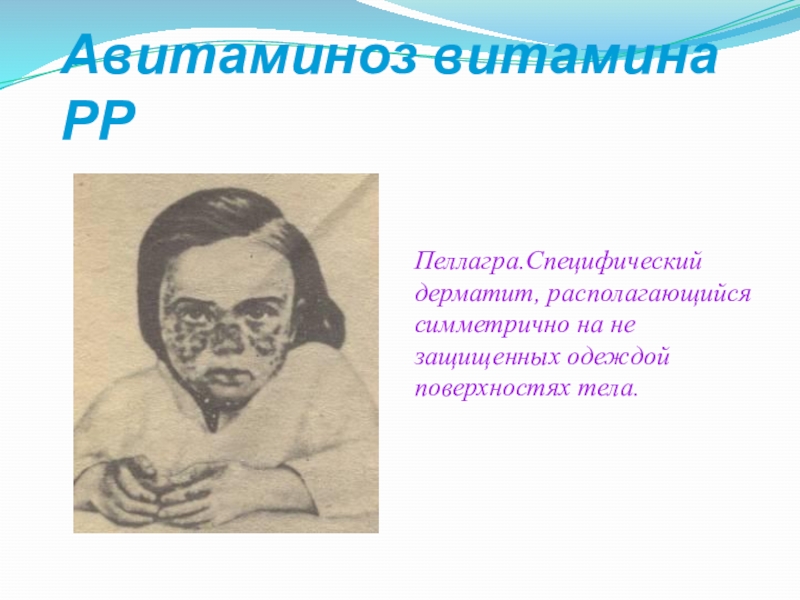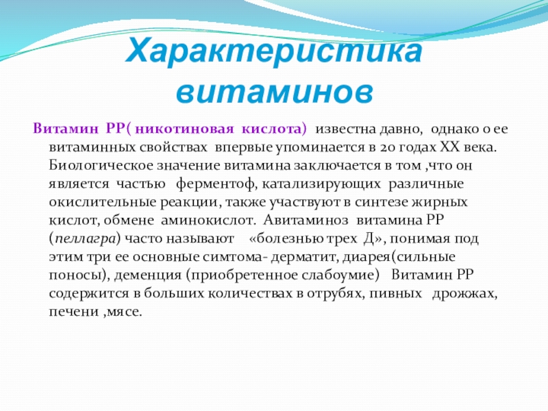 свойствах впервые упоминается в 20 годах XX века. Биологическое значение витамина заключается в том ,что он является частью ферментоф, катализирующих различные окислительные реакции, также участвуют в синтезе жирных кислот, обмене аминокислот. Авитаминоз витамина РР (пеллагра) часто называют «болезнью трех Д», понимая под этим три ее основные симтома- дерматит, диарея(сильные поносы), деменция (приобретенное слабоумие) Витамин РР содержится в больших количествах в отрубях, пивных дрожжах, печени ,мясе.