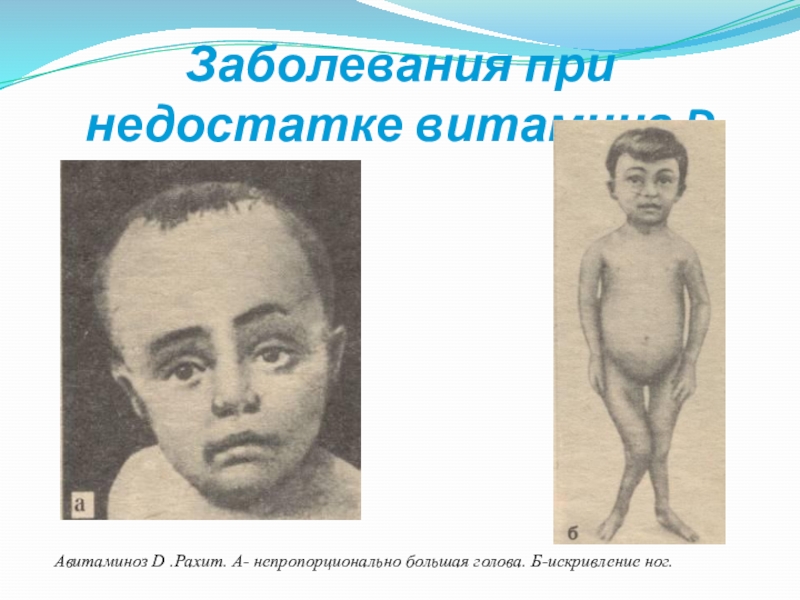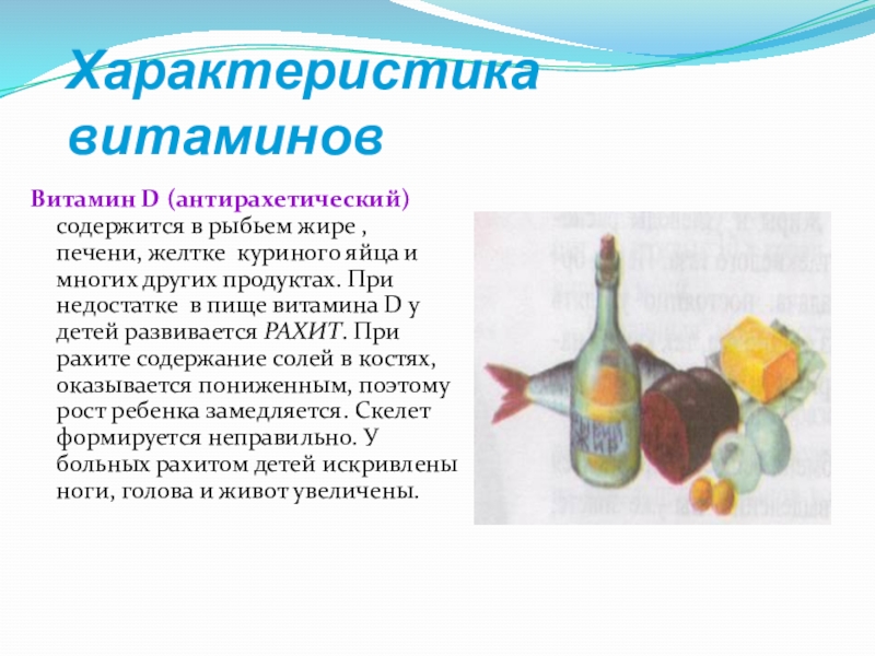 куриного яйца и многих других продуктах. При недостатке в пище витамина D у детей развивается РАХИТ. При рахите содержание солей в костях, оказывается пониженным, поэтому рост ребенка замедляется. Скелет формируется неправильно. У больных рахитом детей искривлены ноги, голова и живот увеличены.