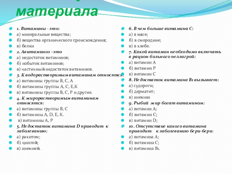 4. Характеристика витаминов (биологическая роль, содержание в продуктах, и заболевания при недостатке витаминов)