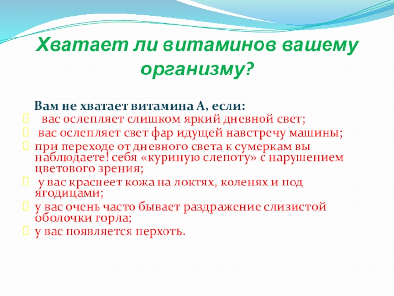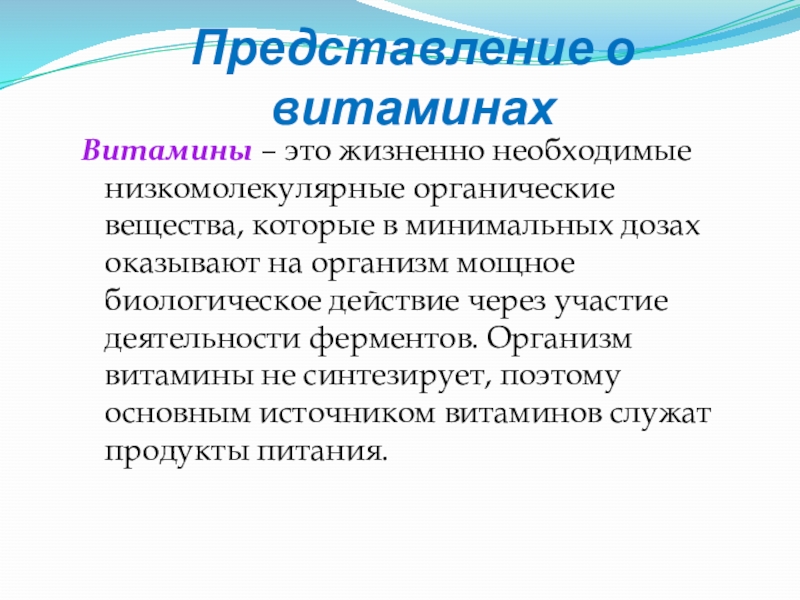 в минимальных дозах оказывают на организм мощное биологическое действие через участие деятельности ферментов. Организм витамины не синтезирует, поэтому основным источником витаминов служат продукты питания.