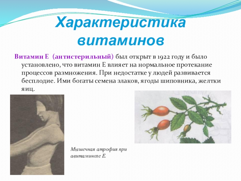 установлено, что витамин Е влияет на нормальное протекание процессов размножения. При недостатке у людей развивается бесплодие. Ими богаты семена злаков, ягоды шиповника, желтки яиц.