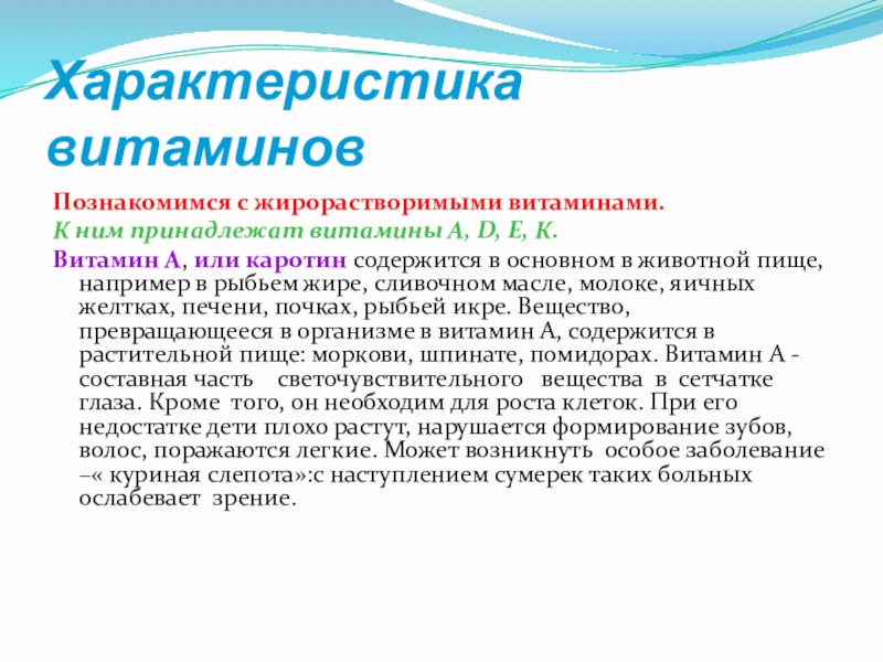 Витамин А, или каротин содержится в основном в животной пище, например в рыбьем жире, сливочном масле, молоке, яичных желтках, печени, почках, рыбьей икре. Вещество, превращающееся в организме в витамин А, содержится в растительной пище: моркови, шпинате, помидорах. Витамин А - составная часть светочувствительного вещества в сетчатке глаза. Кроме того, он необходим для роста клеток. При его недостатке дети плохо растут, нарушается формирование зубов, волос, поражаются легкие. Может возникнуть особое заболевание –« куриная слепота»:с наступлением сумерек таких больных ослабевает зрение.