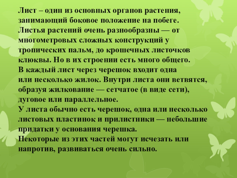 Слайд 12Лист – один из основных органов растения, занимающий боковое положение на