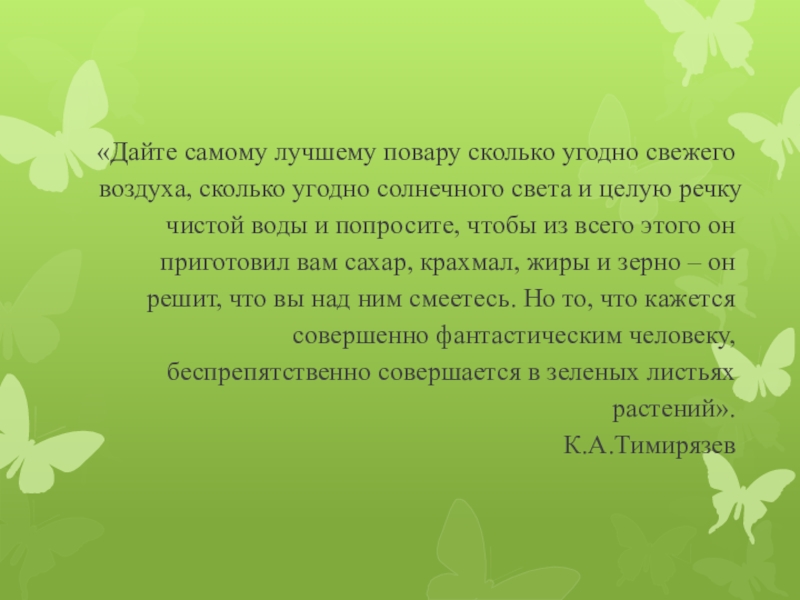 света и целую речку чистой воды и попросите, чтобы из всего этого он приготовил вам сахар, крахмал, жиры и зерно – он решит, что вы над ним смеетесь. Но то, что кажется совершенно фантастическим человеку, беспрепятственно совершается в зеленых листьях растений». К.А.Тимирязев