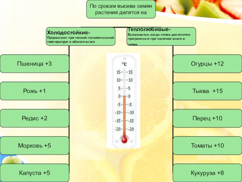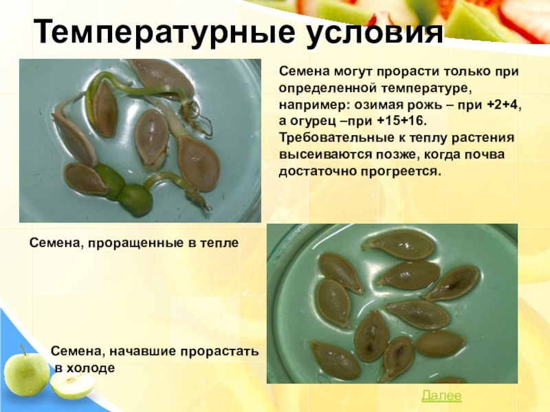 Температурные условия Семена, начавшие прорастать в холодеДалееСемена, проращенные в теплеСемена могут прорасти только приопределенной температуре, например: озимая
