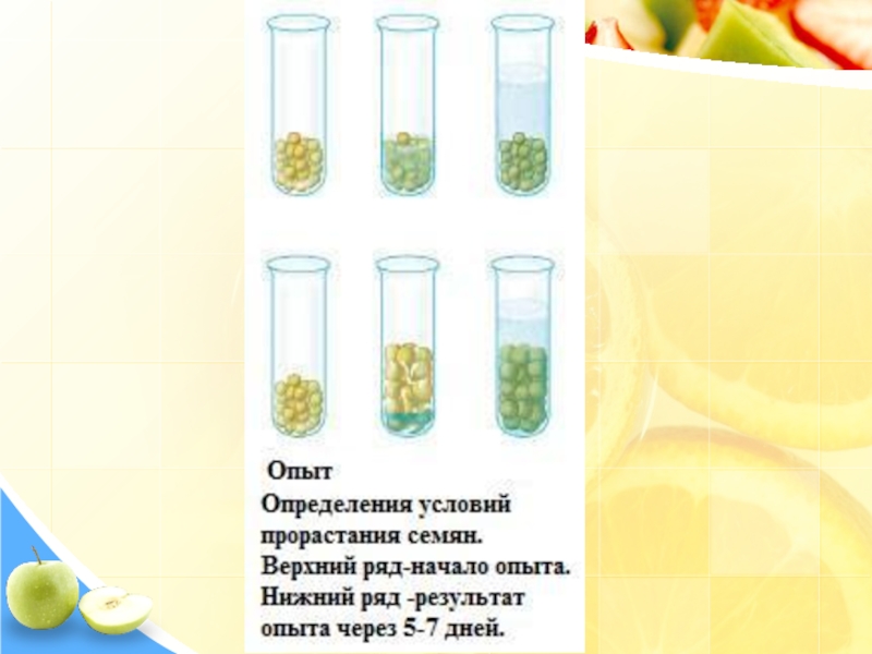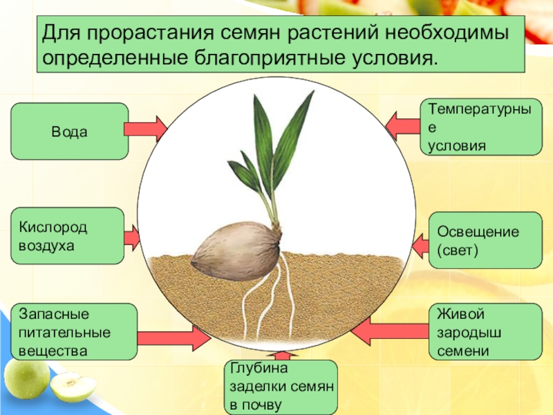 Для прорастания семян растений необходимы определенные благоприятные условия.ВодаЗапасныепитательныевеществаТемпературныеусловияОсвещение(свет)Живойзародыш семениКислород воздухаГлубина заделки семянв почву