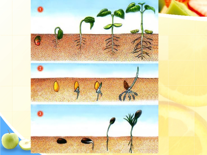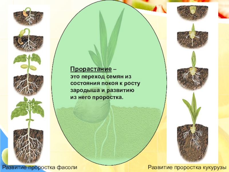 Развитие проростка фасолиРазвитие проростка кукурузыПрорастание – это переход семян изсостояния покоя к ростузародыша и развитию из него