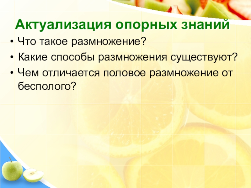 Актуализация опорных знанийЧто такое размножение?Какие способы размножения существуют?Чем отличается половое размножение от бесполого?