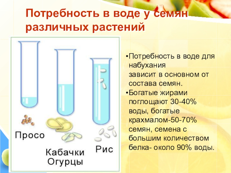 Потребность в воде у семян различных растенийПотребность в воде для набухания зависит в основном от состава семян.