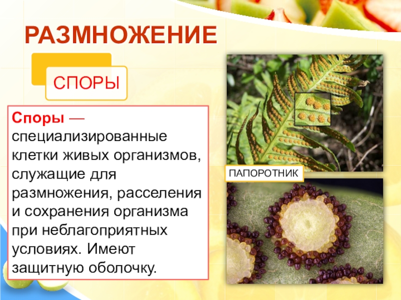РАЗМНОЖЕНИЕСпоры — специализированные клетки живых организмов, служащие для размножения, расселения и сохранения организма при неблагоприятных условиях. Имеют