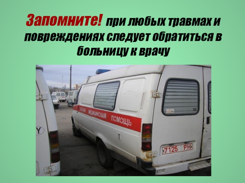 Слайд 20Запомните! при любых травмах и повреждениях следует обратиться в больницу к
