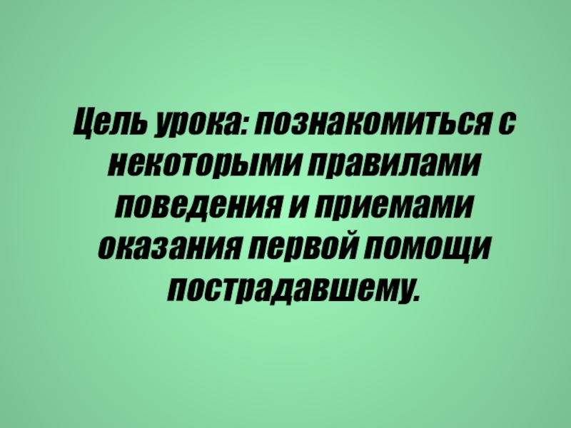 Цель урока: познакомиться с некоторыми правилами поведения и приемами оказания первой помощи пострадавшему.