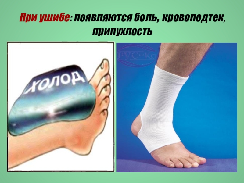 Слайд 12При ушибе: появляются боль, кровоподтек, припухлость