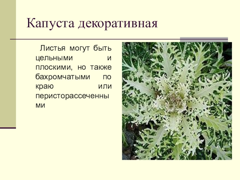 Капуста декоративная  Листья могут быть цельными и плоскими, но также бахромчатыми по краю или перисторассеченными