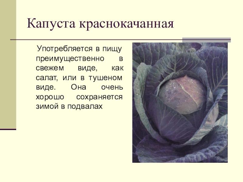 Капуста краснокачанная  Употребляется в пищу преимущественно в свежем виде, как салат, или в тушеном виде. Она