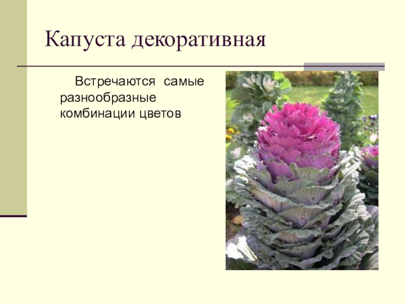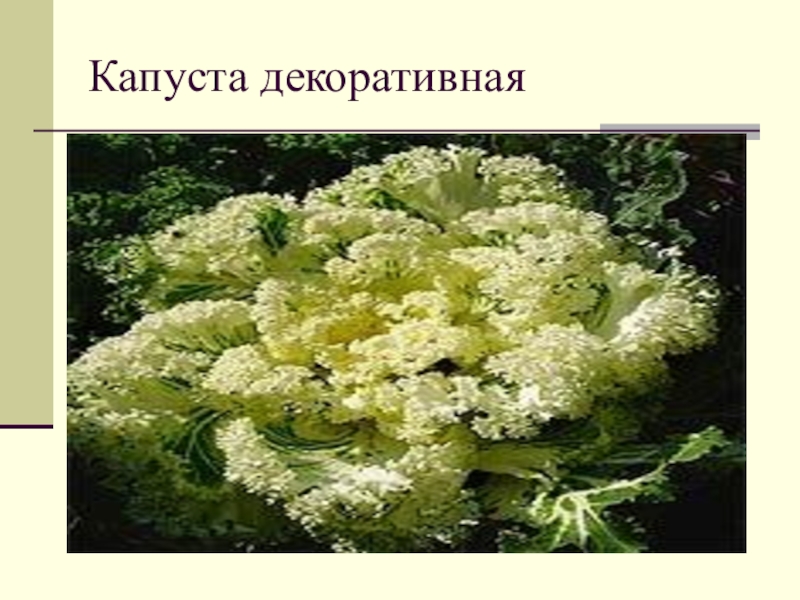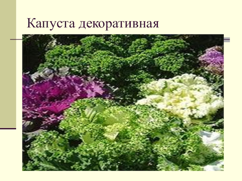 Капуста декоративная  Выведено множество сортов с яркой расцветкой, преимущественно с зеленой окраской наружных листьев и белой