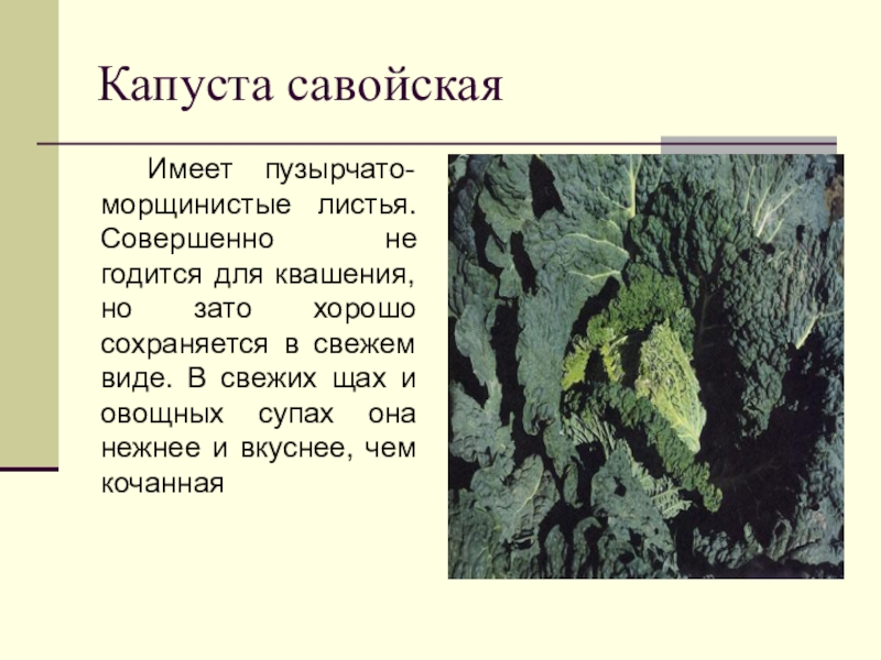 Капуста савойская  Имеет пузырчато-морщинистые листья. Совершенно не годится для квашения, но зато хорошо сохраняется в свежем