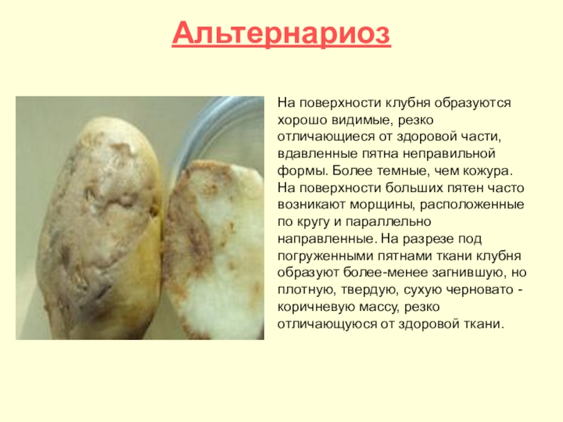 слегка вдавленные пятна. В дальнейшем мякоть под пятном становится сухой, трухлявой, кожица сморщивается; в пораженной части клубня образуются пустоты, заполненные грибницей. и др.). Инфекция распространяется во время хранения на соседние клубни.