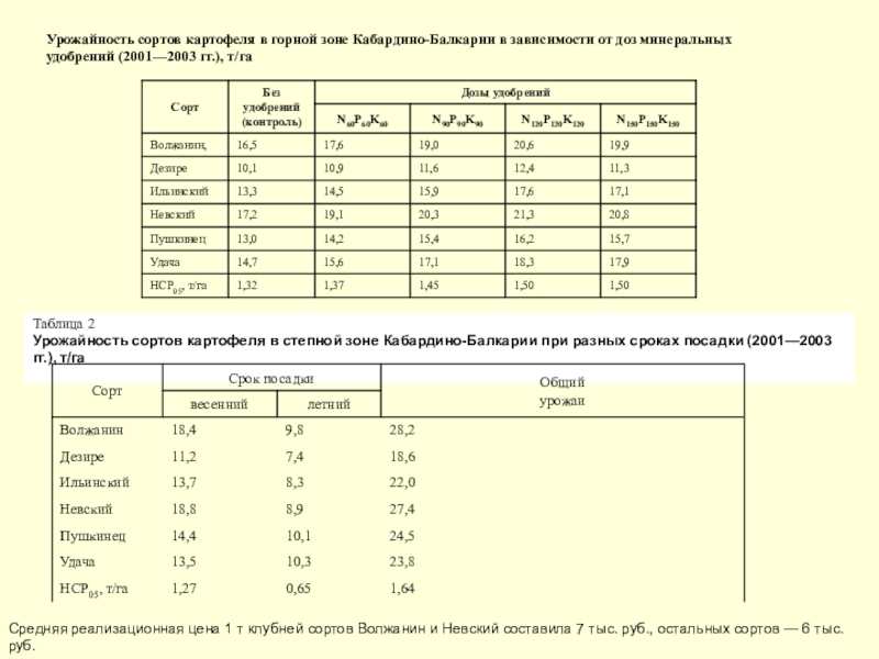 Слайд 20Урожайность сортов картофеля в горной зоне Кабардино-Балкарии в зависимости от доз