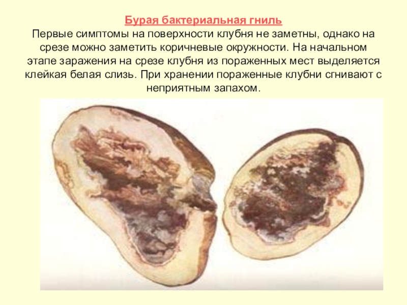 срезе можно заметить коричневые окружности. На начальном этапе заражения на срезе клубня из пораженных мест выделяется клейкая белая слизь. При хранении пораженные клубни сгнивают с неприятным запахом.