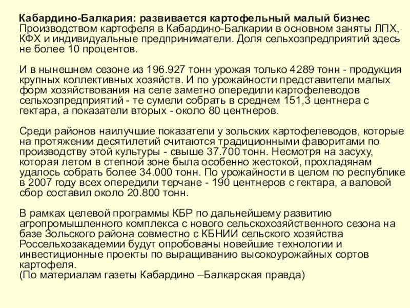 Слайд 29 Кабардино-Балкария: развивается картофельный малый бизнес Производством картофеля