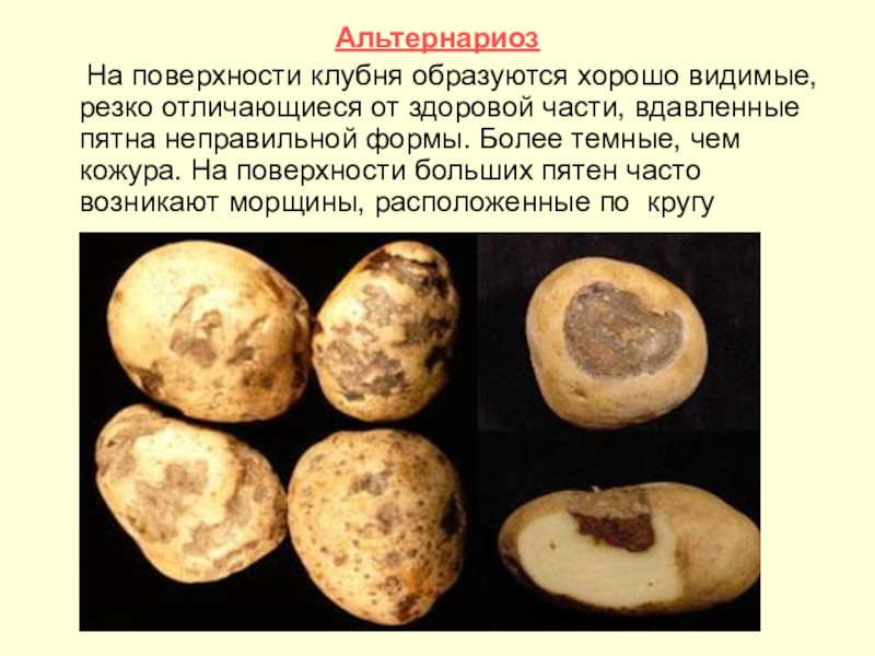 вдавленные пятна неправильной формы. Более темные, чем кожура. На поверхности больших пятен часто возникают морщины, расположенные по кругу и параллельно направленные. На разрезе под погруженными пятнами ткани клубня образуют более-менее загнившую, но плотную, твердую, сухую черновато - коричневую массу, резко отличающуюся от здоровой ткани.