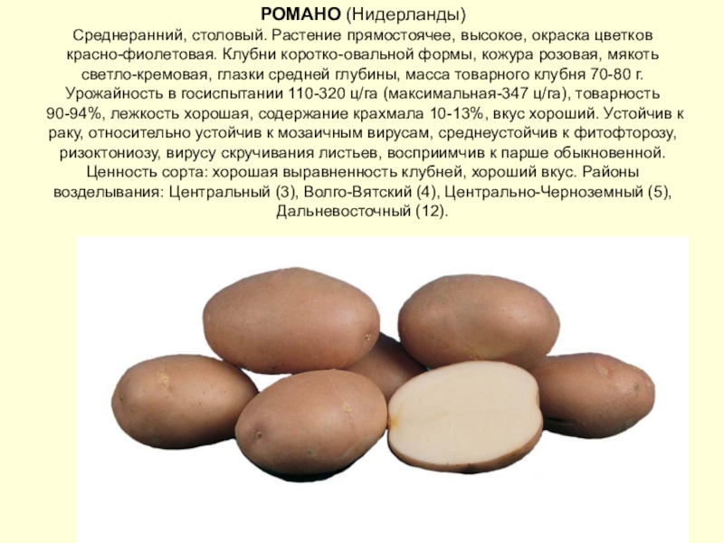 Среднеранний, столовый. Растение прямостоячее, высокое, окраска цветков красно-фиолетовая. Клубни