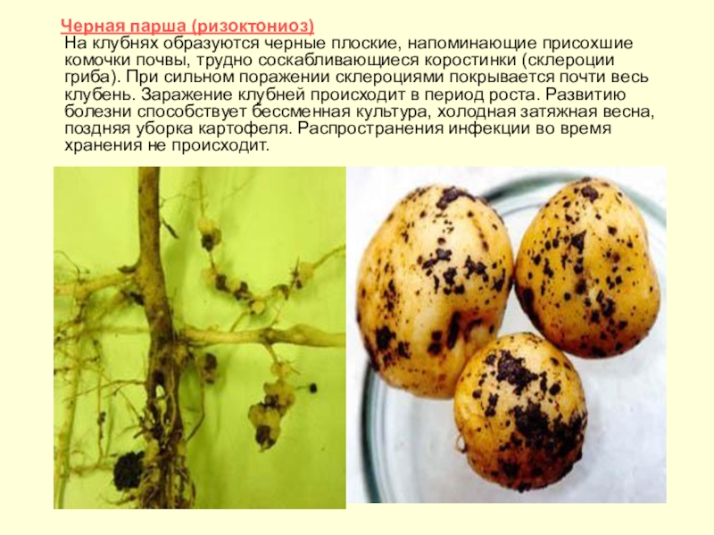 напоминающие присохшие комочки почвы, трудно соскабливающиеся коростинки (склероции гриба). При сильном поражении склероциями покрывается почти весь клубень. Заражение клубней происходит в период роста. Развитию болезни способствует бессменная культура, холодная затяжная весна, поздняя уборка картофеля. Распространения инфекции во время хранения не происходит.