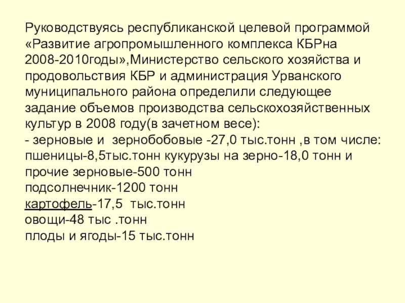 хозяйства и продовольствия КБР и администрация Урванского муниципального района определили следующее задание объемов производства сельскохозяйственных культур в 2008 году(в зачетном весе):