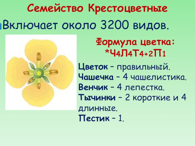 Семейство КрестоцветныеВключает около 3200 видов.Формула цветка: *Ч4Л4Т4+2П1Цветок – правильный.Чашечка – 4 чашелистика.Венчик – 4 лепестка.Тычинки – 2 короткие и 4 длинные.Пестик – 1.